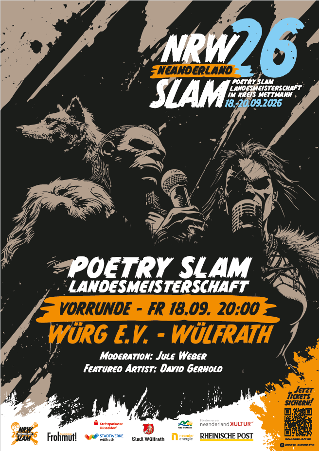 Die deutschsprachigen Meisterschaften im Poetry Slam – dieses Jahr bei uns im Kreis Mettmann. Das angesagteste Bühnenformat gespickt ausschließlich mit den besten Slam Poet:innen aus dem wunderbaren Bundesland Nordrhein-Westfalen!